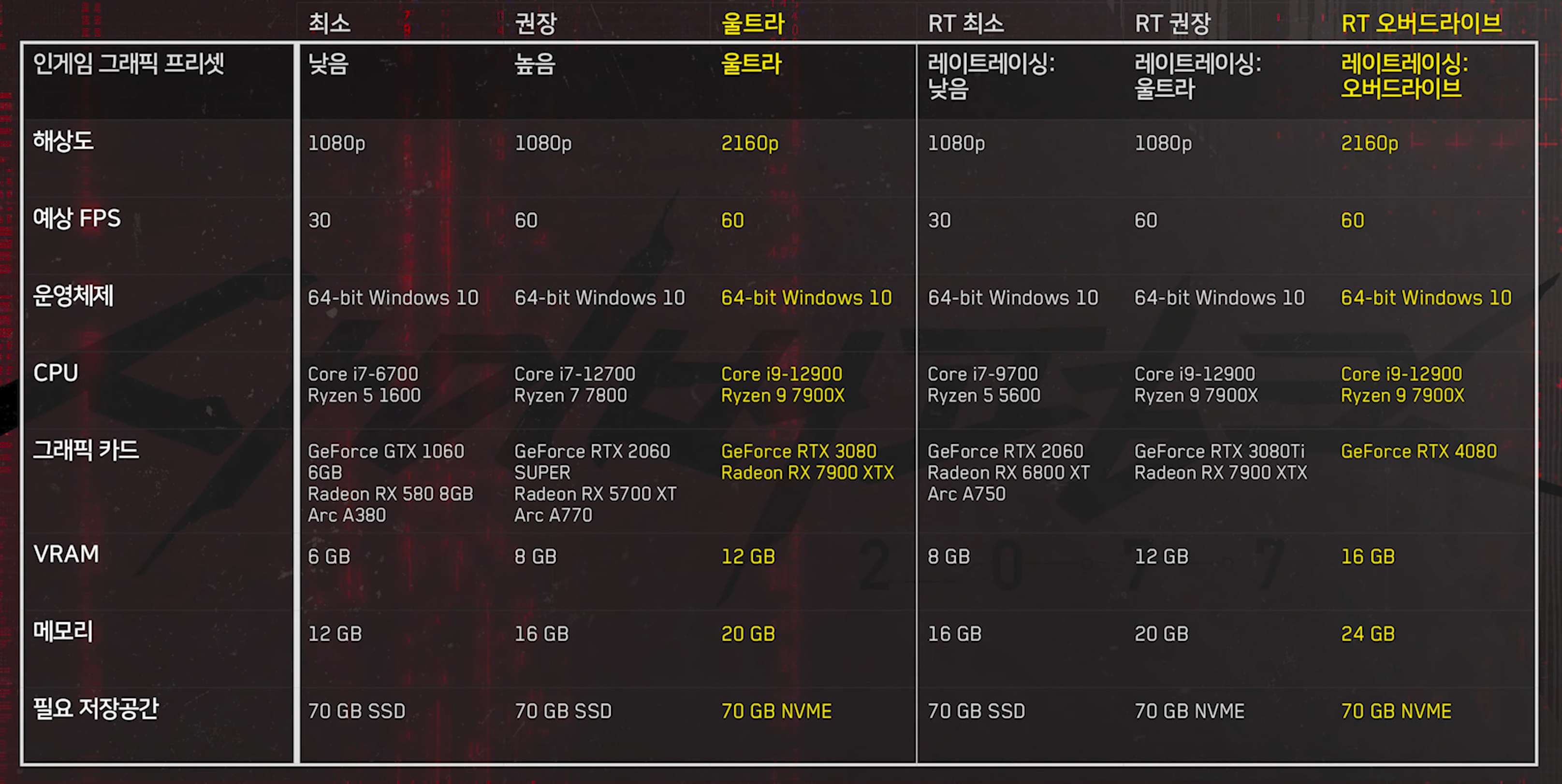 필요저장공간(낮음:70GBSSD,울트라:70GBNVME,오버드라이브:70GBNVME)