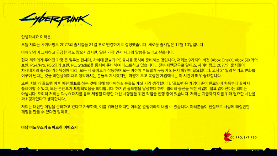 | 게임정보) 사이버펑크 2077 연기 발표이후 컨퍼런스 콜 요약!!! (0) | 2020.10.29 |